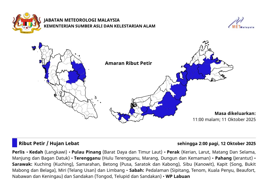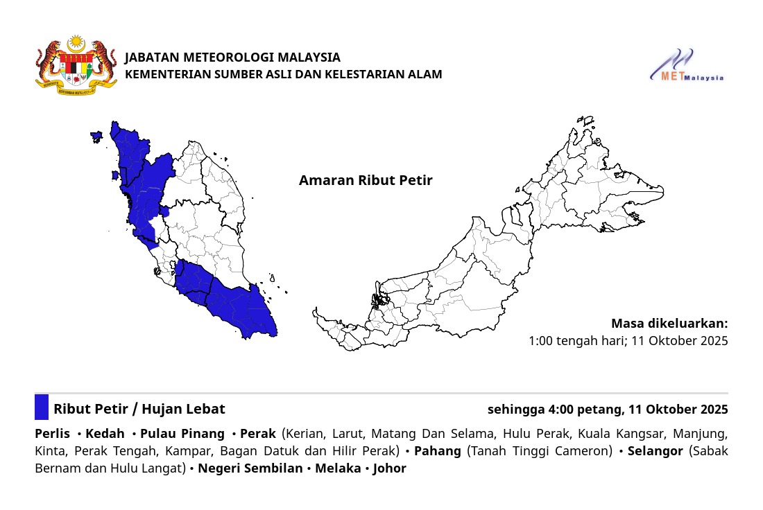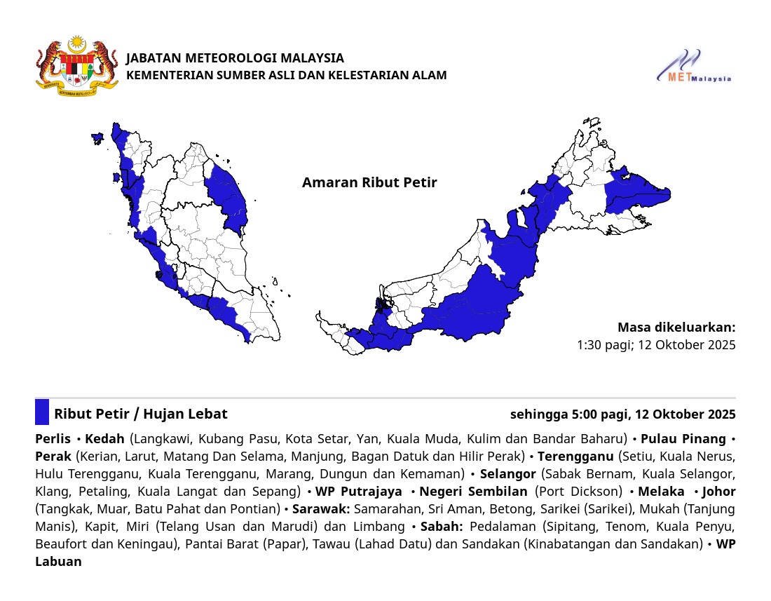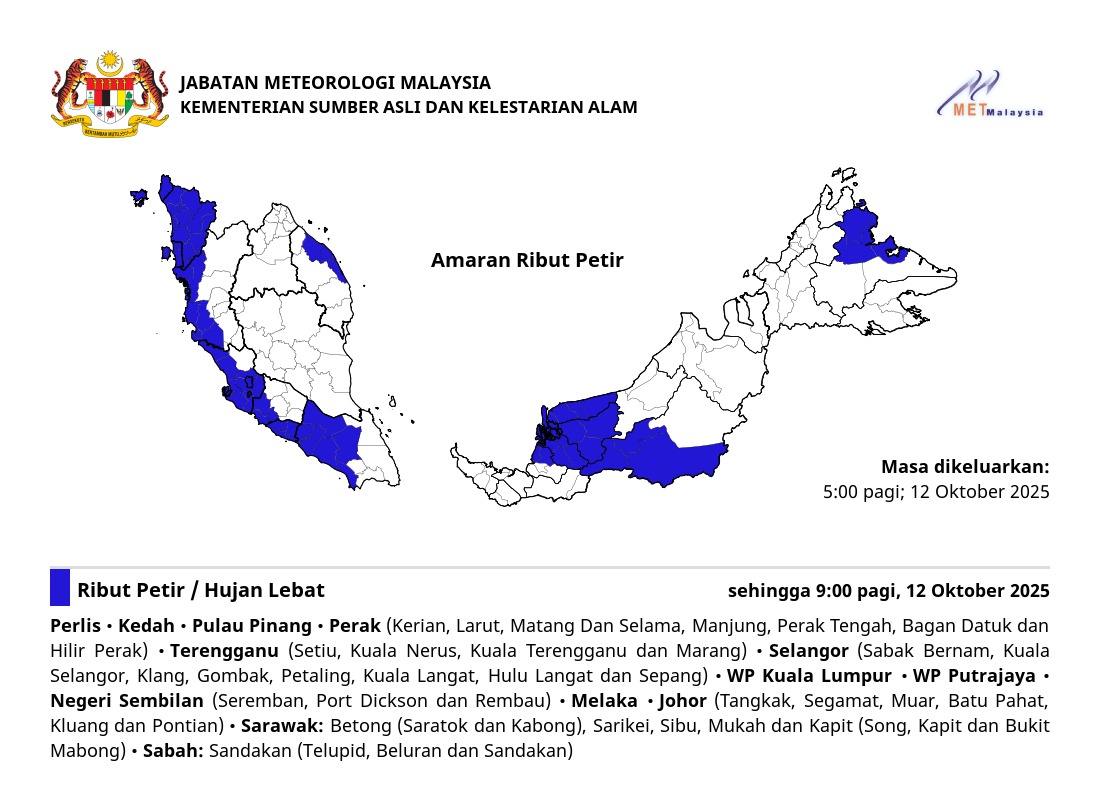 RIBUT PETIR, HUJAN LEBAT DAN ANGIN KENCANG DIJANGKA DI PULAU PINANG SEHINGGA 12:00 TENGAH HARI, RABU, 14 OGOS 2019.