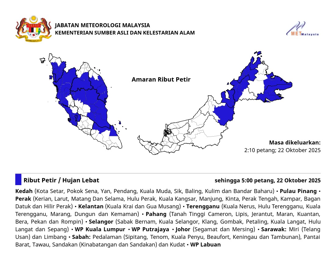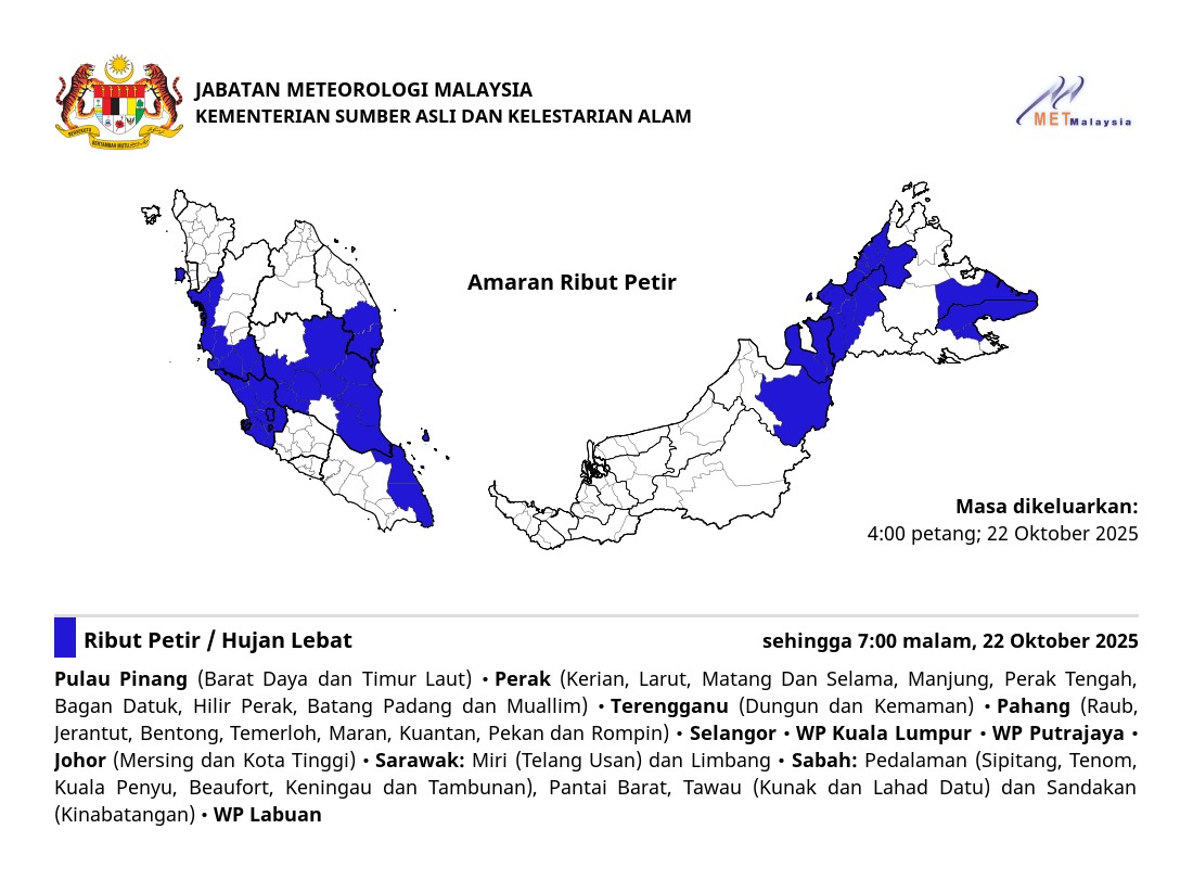 RIBUT PETIR, HUJAN LEBAT DAN ANGIN KENCANG DIJANGKA DI NEGERI PULAU PINANG SEHINGGA 10:00 MALAM, AHAD, 19 JANUARI 2020