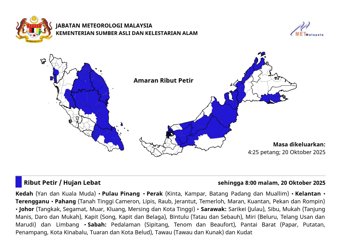 RIBUT PETIR, HUJAN LEBAT DAN ANGIN KENCANG DIJANGKA DI NEGERI PULAU PINANG SEHINGGA 9:00 PAGI, JUMAAT, 16 OKTOBER 2020