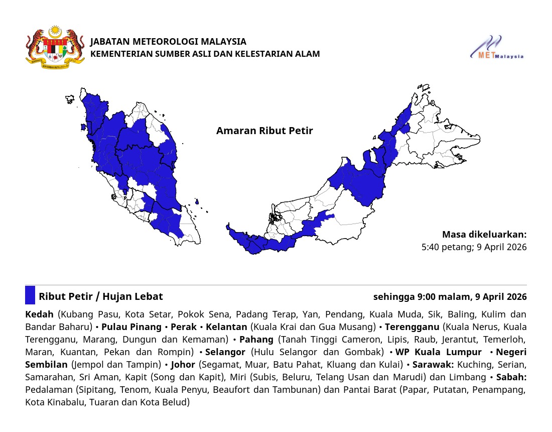 RIBUT PETIR, HUJAN LEBAT DAN ANGIN KENCANG DIJANGKA DI NEGERI PULAU PINANG SEHINGGA 1:00 TENGAH HARI, KHAMIS, 10 JUN 2021.