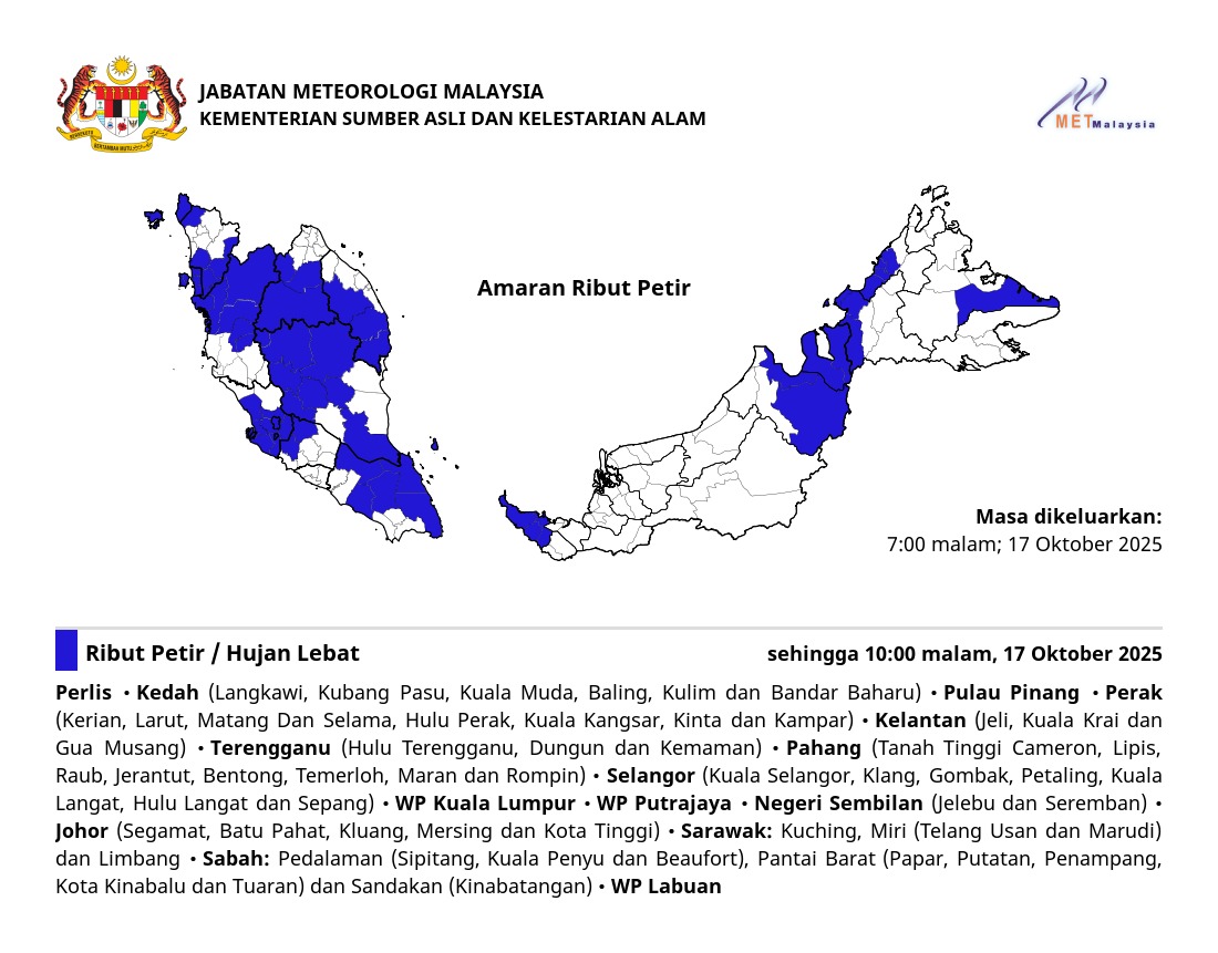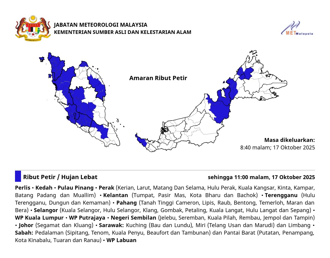 RIBUT PETIR, HUJAN LEBAT DAN ANGIN KENCANG DIJANGKA DI NEGERI PULAU PINANG SEHINGGA 9:00 PAGI JUMAAT, 8 OKTOBER 2021.