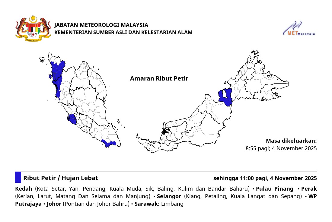 RIBUT PETIR, HUJAN LEBAT DAN ANGIN KENCANG DIJANGKA DI NEGERI PULAU PINANG SEHINGGA 1:00 PAGI, RABU, 20 OKTOBER 2021.