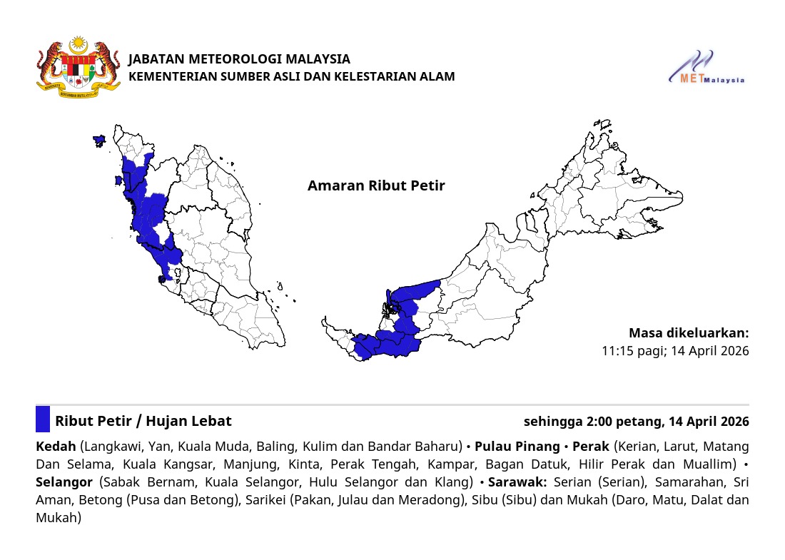RIBUT PETIR, HUJAN LEBAT DAN ANGIN KENCANG DIJANGKA DI NEGERI PULAU PINANG SEHINGGA 10:00 PAGI, SABTU, 30 JULAI 2022.