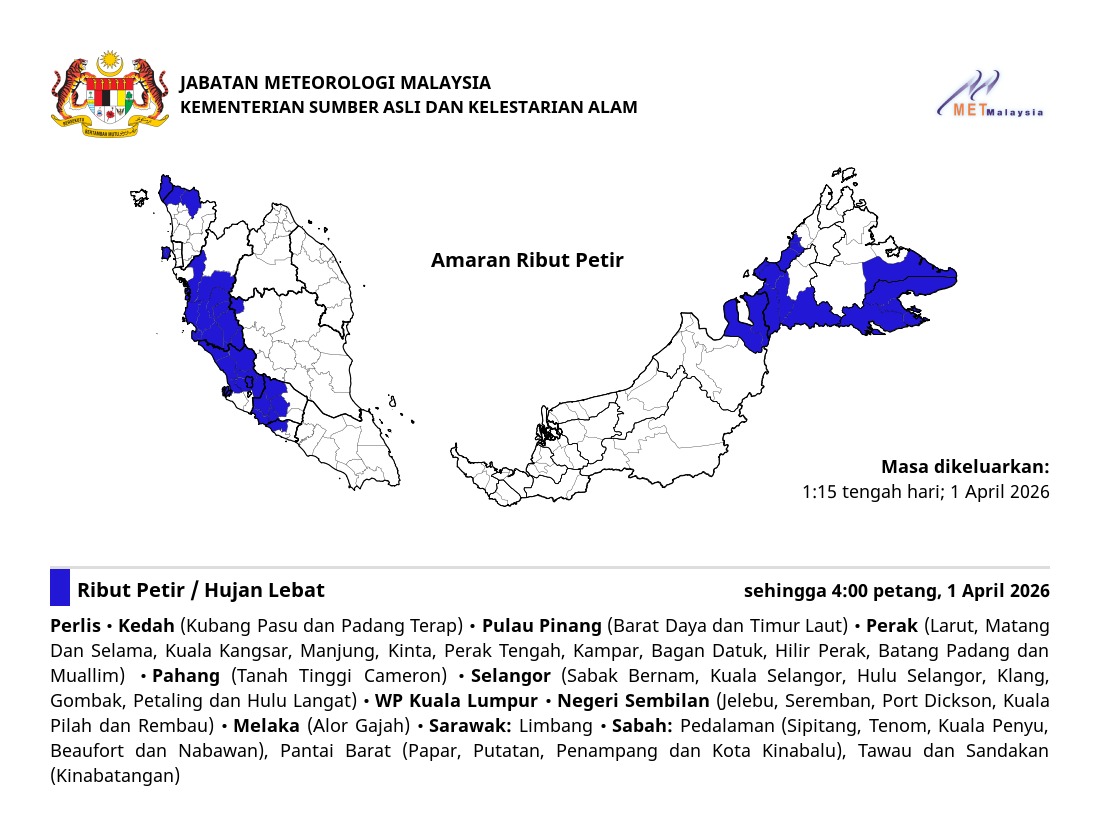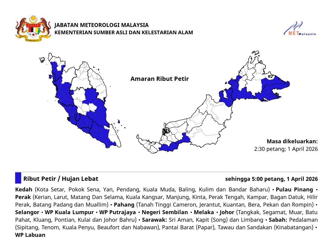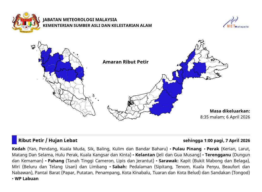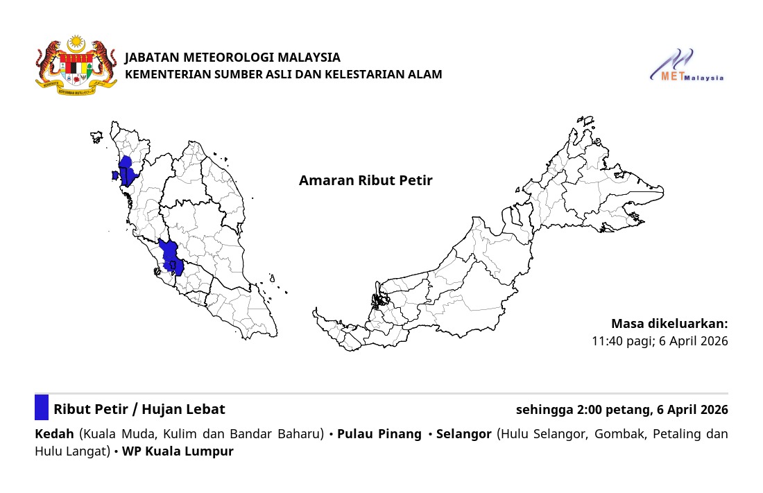 RIBUT PETIR, HUJAN LEBAT DAN ANGIN KENCANG DIJANGKA DI NEGERI PULAU PINANG (TIMUR LAUT, SEBERANG PERAI UTARA DAN SEBERANG PERAI TENGAH) SEHINGGA 9:00 MALAM, SELASA, 21 FEBRUARI 2023.