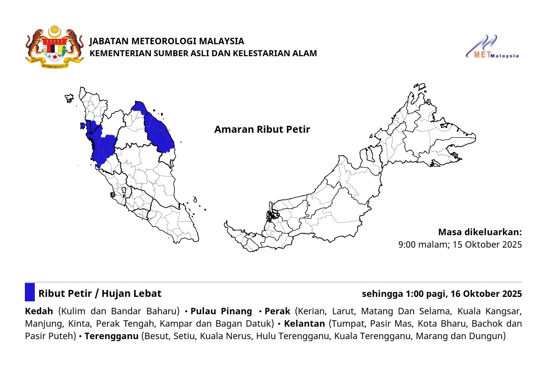 RIBUT PETIR, HUJAN LEBAT DAN ANGIN KENCANG DIJANGKA DI NEGERI PULAU PINANG (SEBERANG PERAI UTARA, SEBERANG PERAI TENGAH DAN SEBERANG PERAI SELATAN) SEHINGGA 9:00 MALAM, SELASA, 15 OKTOBER 2025.