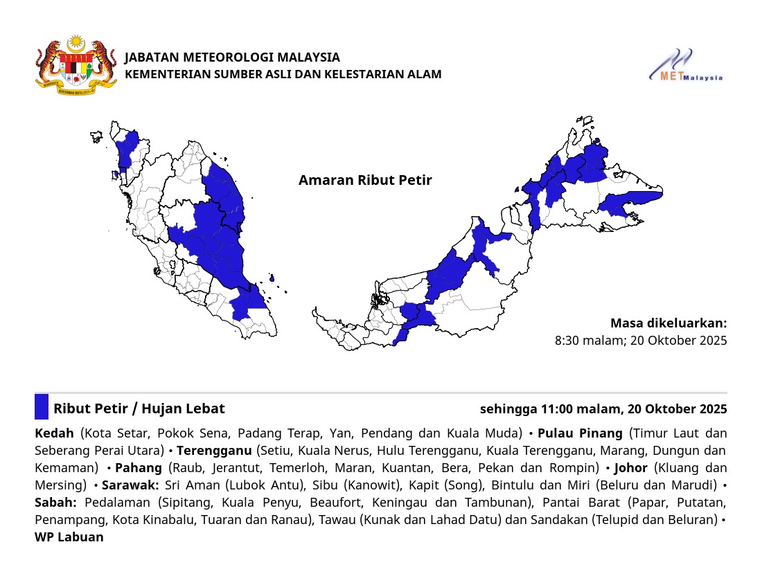 RIBUT PETIR, HUJAN LEBAT DAN ANGIN KENCANG DIJANGKA DI NEGERI PULAU PINANG SEHINGGA 8:00 MALAM, ISNIN, 20 OKTOBER 2025.