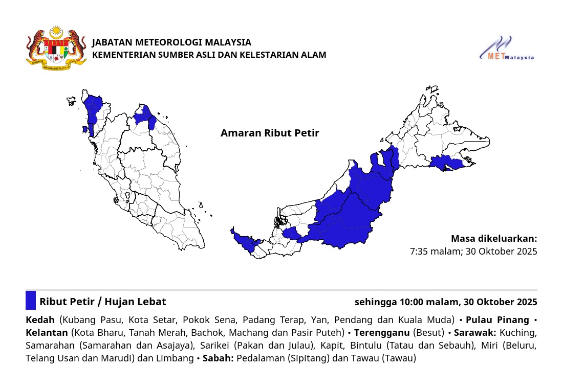RIBUT PETIR, HUJAN LEBAT DAN ANGIN KENCANG DIJANGKA DI NEGERI PULAU PINANG SEHINGGA 9:00 PAGI, KHAMIS, 30 OKTOBER 2025.
