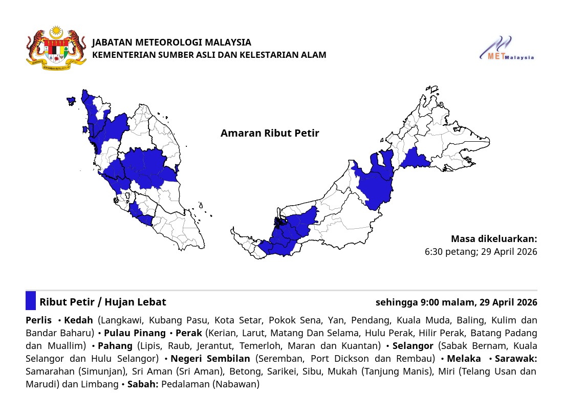 RIBUT PETIR, HUJAN LEBAT DAN ANGIN KENCANG DIJANGKA DI NEGERI PULAU PINANG SEHINGGA 4:00 PAGI, RABU, 29 APRIL 2026.