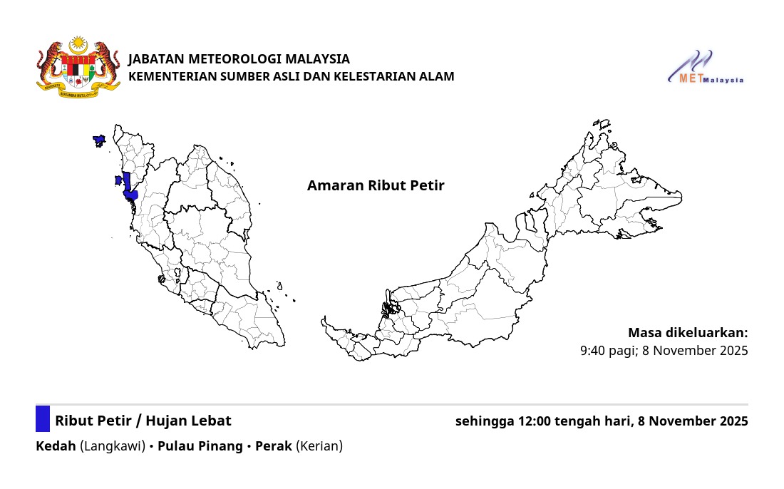 RIBUT PETIR, HUJAN LEBAT DAN ANGIN KENCANG DIJANGKA DI NEGERI PULAU PINANG ) DAN BINTULU SEHINGGA 4:00 PAGI, AHAD, 2 JUN 2019.