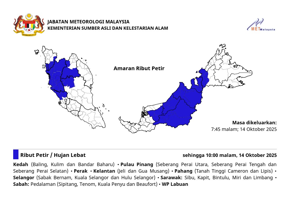 RIBUT PETIR, HUJAN LEBAT DAN ANGIN KENCANG DIJANGKA DI NEGERI PULAU PINANG SEHINGGA 8:00 PAGI, KHAMIS, 20 JUN 2019.