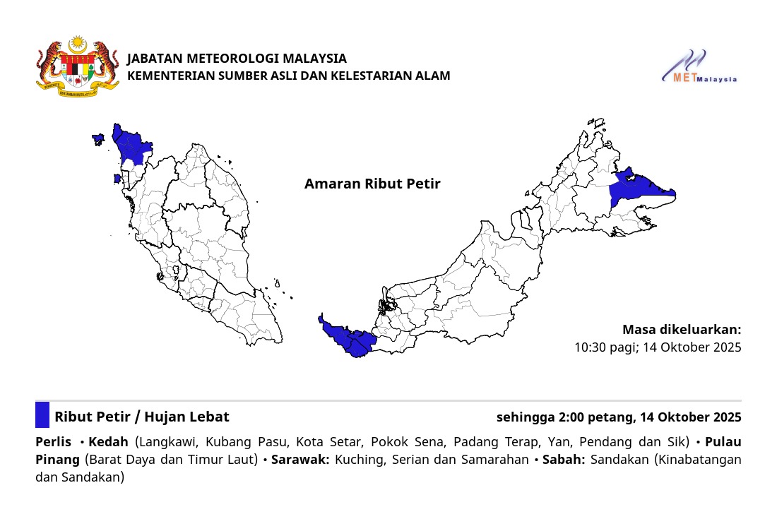 RIBUT PETIR, HUJAN LEBAT DAN ANGIN KENCANG DIJANGKA DI NEGERI PULAU PINANG SEHINGGA 2:00 PETANG, KHAMIS, 20 JUN 2019.