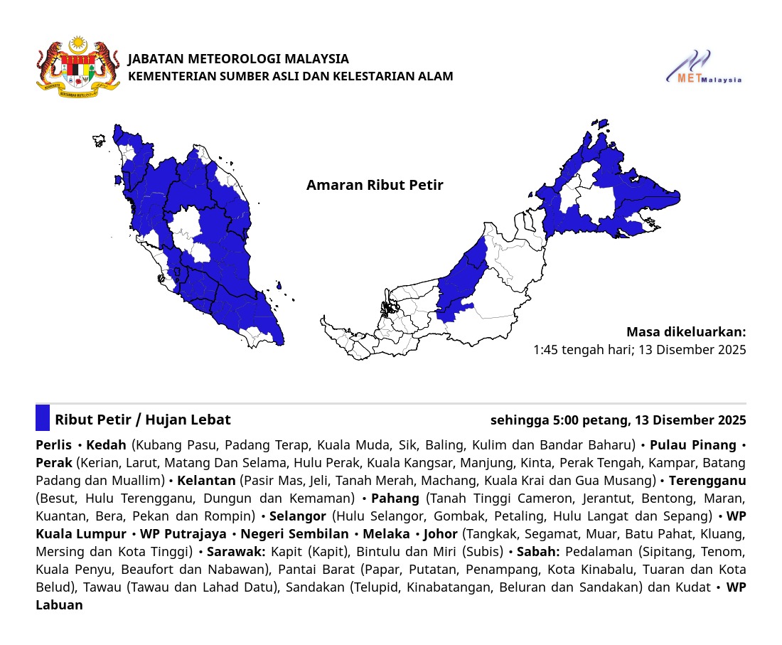 RIBUT PETIR, HUJAN LEBAT DAN ANGIN KENCANG DIJANGKA DI NEGERI PULAU PINANG SEHINGGA 1:00 PAGI SABTU, 13 JULAI 2019.